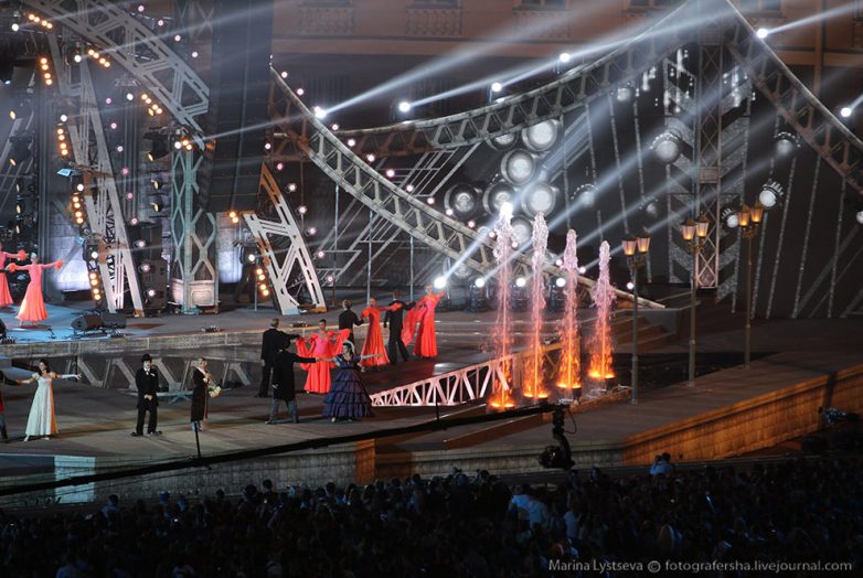 Около 11 вечера начался концерт на Дворцовой площади, где ведущим был Иван Угрант. Открывали музыкальное шоу «Ночные снайперы» с Дианой Арбениной…
