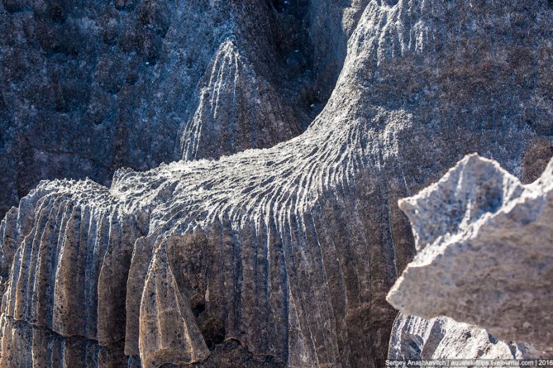 По пути много скал с явно выраженными следами древних окаменелостей. Дело в том, что когда-то эти места были дном океана и находились под водой. Потом участок поднялся над уровнем моря, и растворять породу продолжили дожди, которые создавали в ней все более глубокие расщелины, пока не появились эти фантастические острые гребни и иглы известняка длиной до 50 метров.
