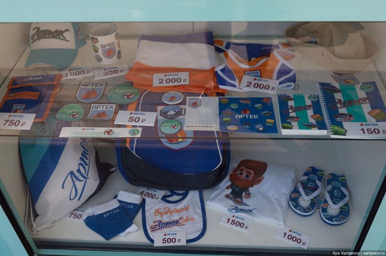 А вот и цены. На мой взгляд, сотрудники «Артека» охренели. Продавать детям брендированную футболку за 1500 — это …. Маленькие наклейки по 25 рублей, чашка 300, блокнот 150. Конечно, тут все сделано так, что ребенок сразу хочет оставить тут все свои деньги. В общем, хороший бизнес развернули в лагере.