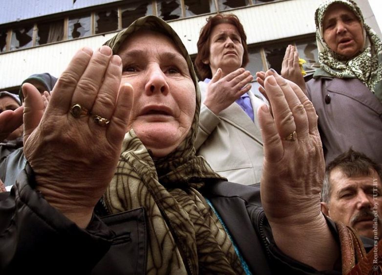 Женщина, потерявшая своих родственников во время войны 1992-1995 гг., молится во время митинга на День независимости Боснии, 1 марта 2002 года.