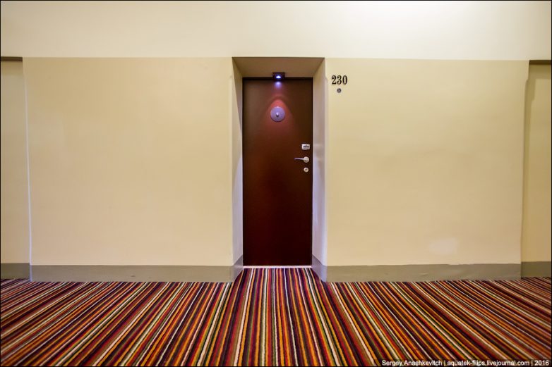 Сами двери, конечно, заменили. Но глазки оставили такими же, как в камерах. В коридорах можно заметить, что двери чередуются с замурованными входами. Дело в том, что каждый номер сделан из двух камер. Иначе, это были бы не номера, а комнатушки без собственного санузла.