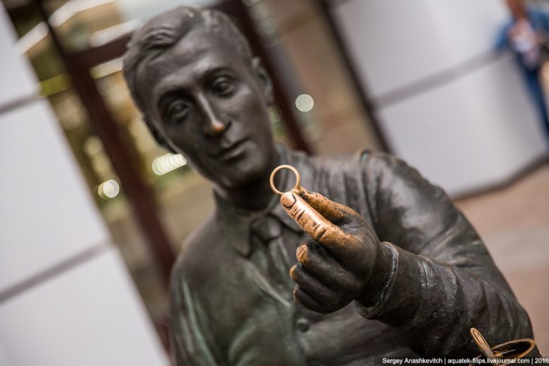 Еще одна знаменитая городская композиция — бронзовый памятник ювелиру, который протягивает обручальное кольцо.