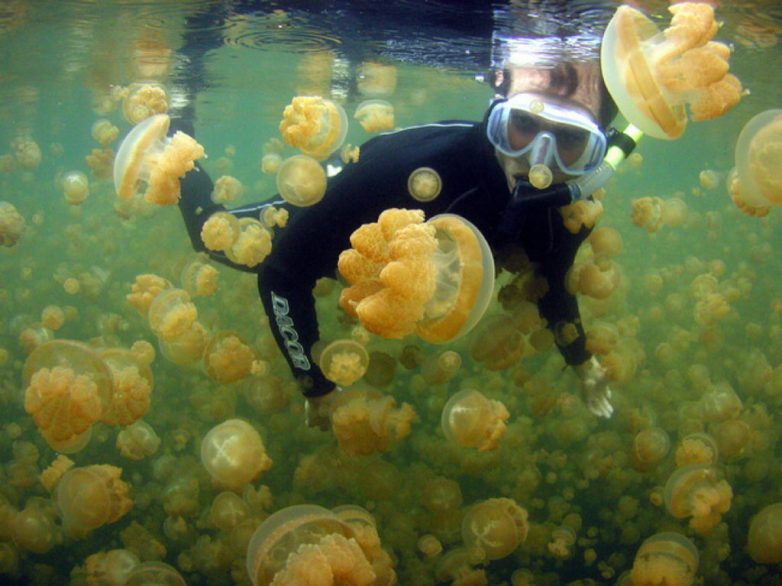 В Тихом океане, на одном из островов архипелага Палау есть удивительное озеро, в котором живут только медузы. Они совсем неопасны, потому что утратили способность жалить. Ведь озеро отрезано от океана, а медузы являются единственными его обитателями. Их плавные передвижения в воде представляют собой фантастическое зрелище. Вода в озере токсична, что не дает возможности заниматься в нем дайвингом. Для неглубокого погружения используется маска, но и этого достаточно, чтобы наблюдать за «танцами» медуз.
