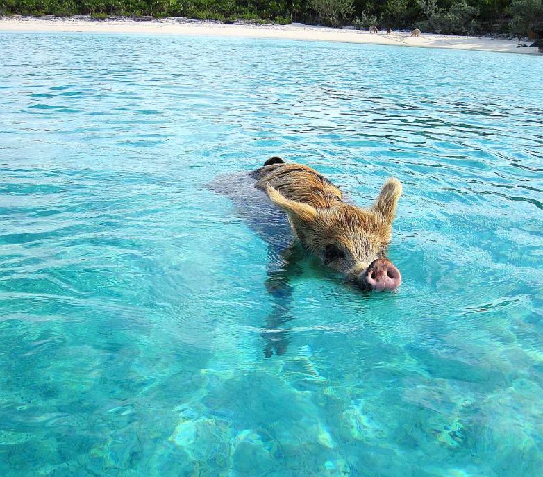 Остров Сау из Багамского архипелага обнаружен недавно, уже очень популярен и его называют «свиным» островом из-за большого количества обитающих там этих животных, которые не прочь поплавать в прибрежных водах. Предполагают, что они обосновались там после кораблекрушения. Свинки с удовольствием плещутся возле берега на радость туристам, которые подкармливают их разными лакомствами.
