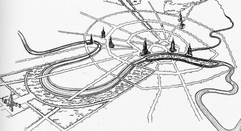 32. Сторонники теории заговоров верят, что сталинские высотки были расположены в особом геометрическом порядке. В центре фигуры, образованной «сталинскими сестрами», должен был располагаться Дворец Советов.