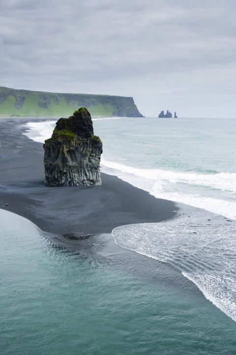 Черный пляж, состоящий из черного гравия и черных валунов. Также здесь можно увидеть знаменитые базальтовые колонны, именуемые в народе «пальцами тролля».