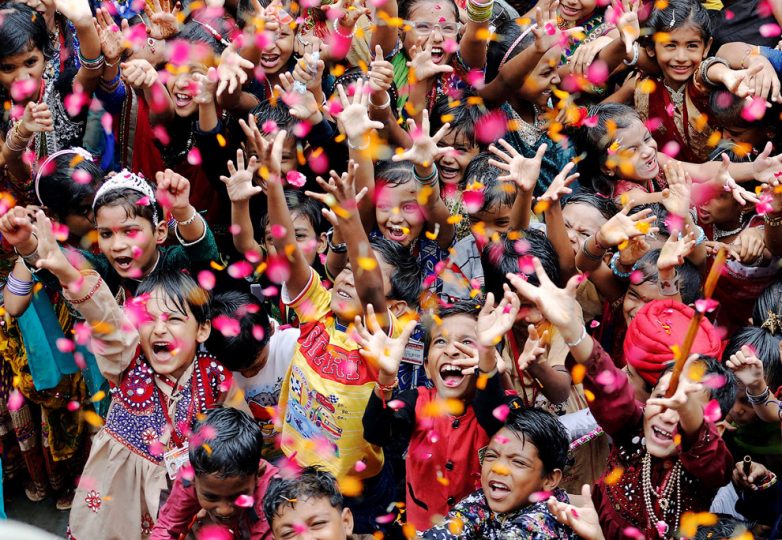 Тем временем в школах Ахмадабада. Девочки одеты в костюмы Ра́дхи. Это одна из женских форм Бога в индуизме. В пуранических текстах описывается как вечная возлюбленная Кришны, воплотившаяся вместе с ним на земле более 5 000 лет назад.