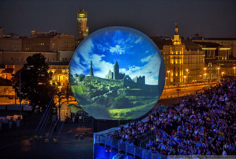 При смене участников сменялась картинка на двух огромных шарах, и подсветка Покровского собора.