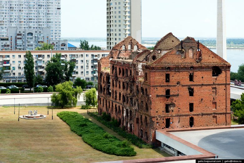 Мельница была построена в 1904 году. При восстановлении города после войны мельницу решили оставить как есть в качестве живого свидетельства разрушительной Сталинградской битвы.Слева видна скульптура «Танцующие дети» — копия фонтана «Детский хоровод», установленного на Привокзальной площади. Скульпторы в камне воплотили знаменитый снимок советского фотографа Эммануила Евзерихина, запечатлевшего чудом уцелевший весёлый детский хоровод на фоне разрушенного бомбёжкой Сталинграда.