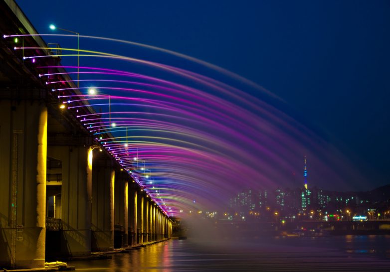 Фонтан и красивый мост – сочетание не совсем обычное. До 2008 года сеульский мост Банпо, соединяющий берега реки Хан, мало чем отличался от других. Но с появлением на нем необычного фонтана «Лунная радуга» он сразу же стал одной из главных городских достопримечательностей. Идея превратить мост в фонтан пришла властям южнокорейской столицы не случайно (при этом мост не потерял своей основной функции — переправы с одной стороны реки Хан на другую).
