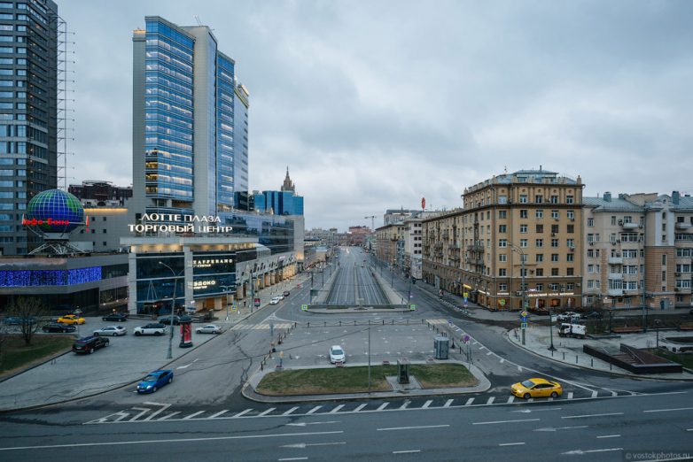 Новый Арбат выглядит как громадная непрерывная стена высоких зданий, со коктейлем из сталинской высотки и Москва-сити в перспективе.