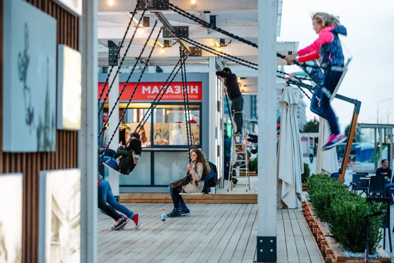 Качели, как и на Триумфальной площади, вечером все заняты.