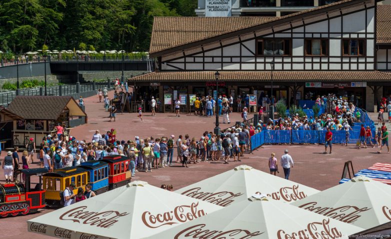 12. Добираемся до подъемников. Основных два: Олимпия и Стрела. Стрела был на ремонте, пришлось вклиниваться в очередь на первый. Бизнес хороший! Я бы на месте организаторов повесил электронное табло на котором показывалось бы текущее состояние счета. На семью из трех человек покатушки стоят около 3 500 руб, а поток людской не иссякает…