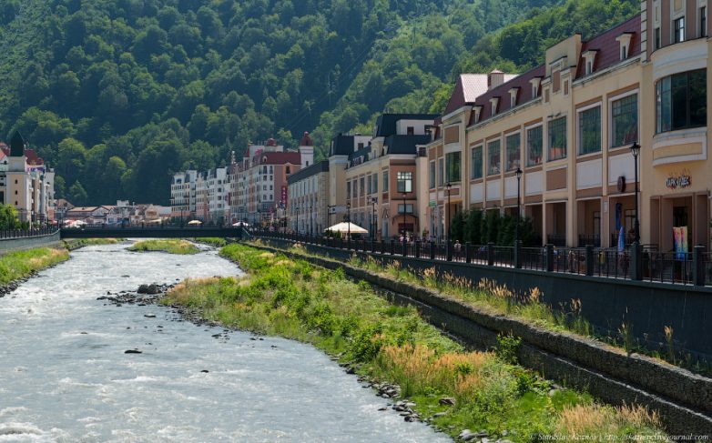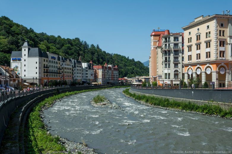 4. Река Мзымта нынче ограничена двумя набережными: наб. Панорама и наб. Лаванда. Также параллельно проходит Олимпийская улица.