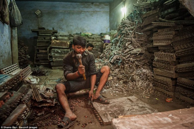 12-летний Сахил работает вместе с мамой в маленьком цехе металлолома. Он говорит: «Я провожу девять часов с мамой каждый день, доставая медь, свинец, алюминий и иногда золото из старых микросхем. Хозяин платит маме 200 рупий».