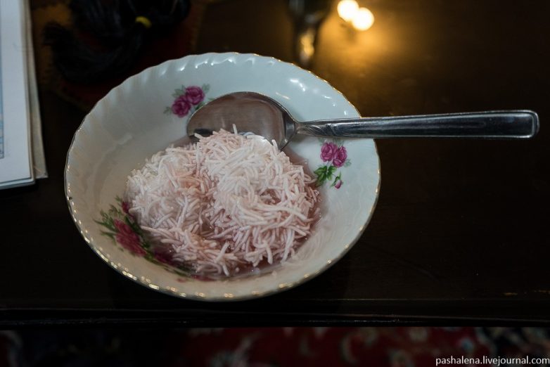 После трапезы последовал очень необычный исламский десерт «фалюде» — замороженные с розовой водой нити пищевого крахмала, которые сверху поливают кисло-сладким лимонным соусом.