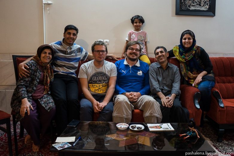 Наш новый друг и наш хост, Багхер, встретил нас на машине и отвёз в дом, где живёт его семья. Семьи у иранцев большие, гостей и родственников также много, поэтому наше фото на память можно назвать достаточно малочисленным. Позже в гости к Багхеру и его родителям пришло ещё человек пять родственников.