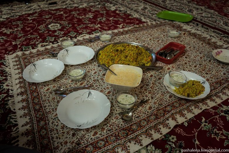 Главное блюдо — огромная порция риса без мяса с овощами и ароматными специями. С ошем принято есть овощные кисломолочные соусы, в данном случае огуречный и тыквенный. Едят прямо с постеленной на ковре узорчатой скатерти. Немного непривычно есть с пола. Плов очень вкусный, нигде такого не пробовали. В Узбекистане тоже вкусный, конечно, но более привычный нам :)