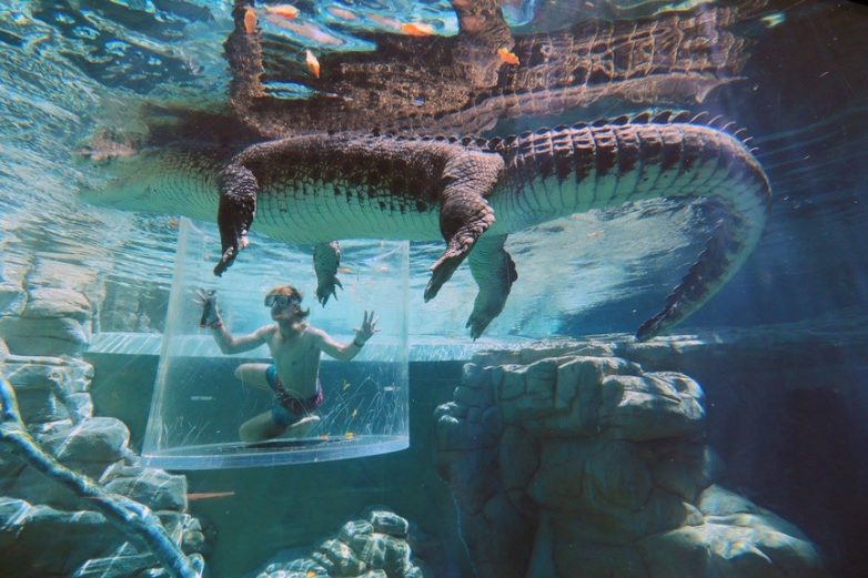 В австралийском парке Crocosaurus Cove, расположенном в городке Дарвин на севере страны, можно поплавать с шестиметровыми гребнистыми крокодилами.Смельчаки погружаются в бассейн в цилиндре из прочного акрилового стекла, толщина которого достигает четырех сантиметра. Всего в парке обитают около 100 крокодилов.