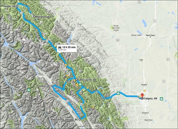 Одна неделя в сентябре. Всего мы наездили около 2 тысяч км (на карте маршрут примерный). Даже в супермаркете были всего раз в Калгари по прилету и удивительно точно рассчитали набор продуктов на неделю. Машина, палатка, рюкзак — и в горы!