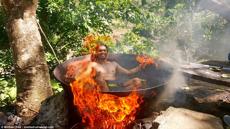 Майкл Диес из Манилы решил провести свой отпуск в тропической обстановке Тибиао на Филиппинах, чтобы ощутить полное единение с природой. Казалось, что он варится в кипятке «кавы», когда он позировал для серии фотографий, наслаждаясь купанием в кипящей воде.