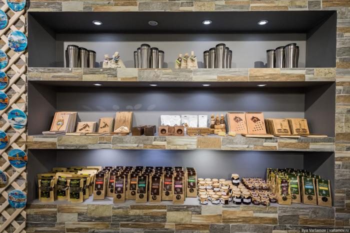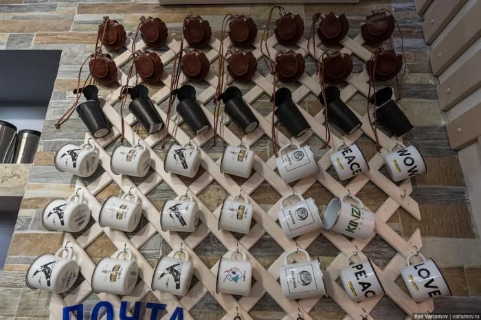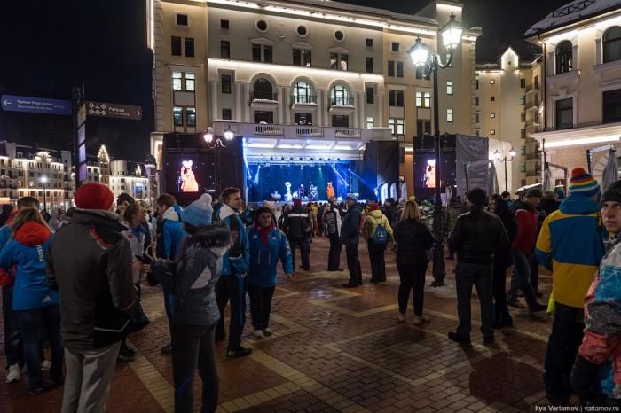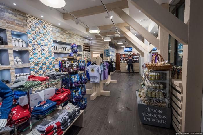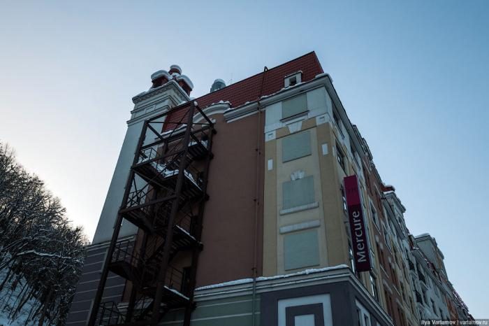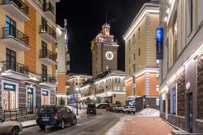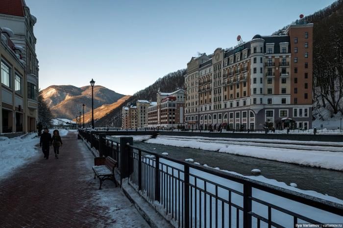 Во-первых, это не санаторий, не деревня, но именно городок, а во-вторых, это не закрытый объект Газпрома или администрации президента, но город для людей. Здесь десятки отелей, ресторанов, магазинов, сложная система улиц, мосты, площади — это не режимный объект, управляемый одной структурой, но именно город, где много разного. Здесь есть набережная! Здесь есть торговая улица и площадь! Здесь дома разной высоты стоят друг к другу под разными углами! У них разные окна! Витрины разные! У Потанина получилось построить город, который поразительно напоминает Карловы Вары, так, будто он действительно стоит здесь уже много лет.