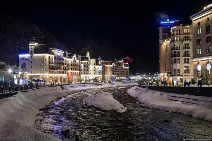 Про трассы и условия я расскажу еще отдельно. А пока давайте посмотрим на сам курорт. Как и «Горки Город», «Роза Хутор» – это небольшой городок. Но он выгодно отличается от конкурента. Во-первых, «Роза Хутор» расположена не вдоль оживленной трассы, а по обе стороны реки Мзымта.
