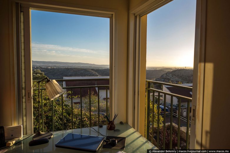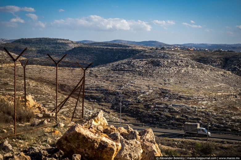 19. Поселение, в котором я был, очень маленькое, и работы в нём практически нет. Но всего за час отсюда можно добраться до Иерусалима или Тель-Авива, крупнейших городов страны. Обычно дорога не опаснее, чем ваш путь на работу. Но в периоды арабских беспорядков и волн террора путь превращается в опасное испытание. Трассу постоянно патрулируют военные, а сами поселенцы предпочитают не выезжать за территорию без личного оружия.