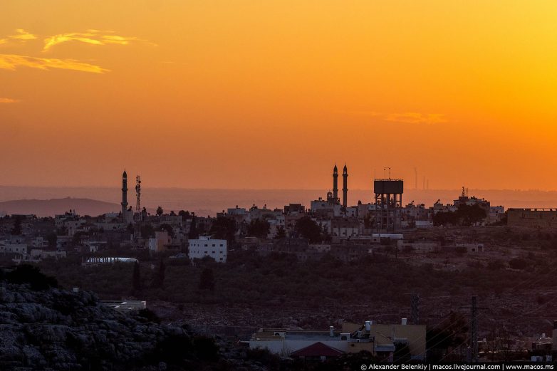 17. Некоторые страны и ООН осуждают строительство поселений за “зелёной чертой” и требуют немедленно покинуть эти земли. Евреи отказываются. Глядя на эту фотографию, легко понять — почему. Вон там, на горизонте, виден берег моря и высотные здания. Это Тель-Авив. Отсюда до него долетит любая ракета и поразит любую цель. Наивно думать, что если отдать эти посёлки арабам, они не станут стрелять.