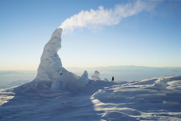 Гора Эребус — второй по величине вулкан Антарктиды, активен с 1972 года. На Эребусе много ледяных башен, сформированных в результате паровой эмиссии из-за вулканической активности. Многие ледяные башни постоянно испускают пар. В дополнение к этим подобным дымоходу столбам вулканическая гора является родиной множества ледяных пещер, сформированных естественным способом, с синими, устрашающе пещеристыми подземными палатами.