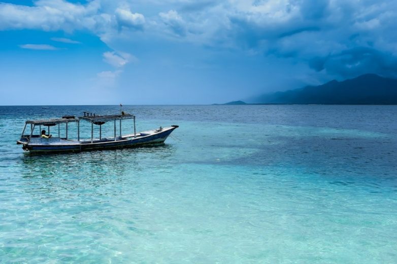 Вид с острова Менджанган на Бали. Вершина вулкана Агунг как обычно окутана дождевыми облаками