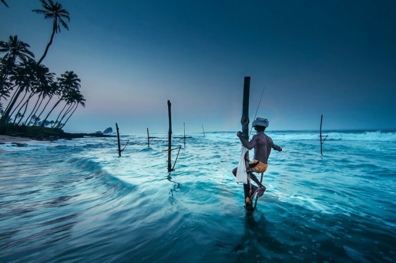 Шри Ланка, Коггала. Местные рыбачат исключительно с таких насестов, и даже в тихую погоду прибой то обнажает низ столба, то касается ног рыбака