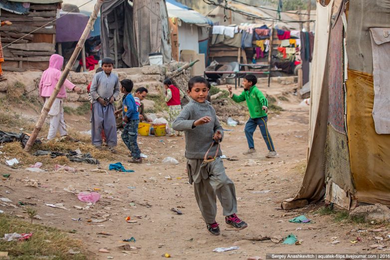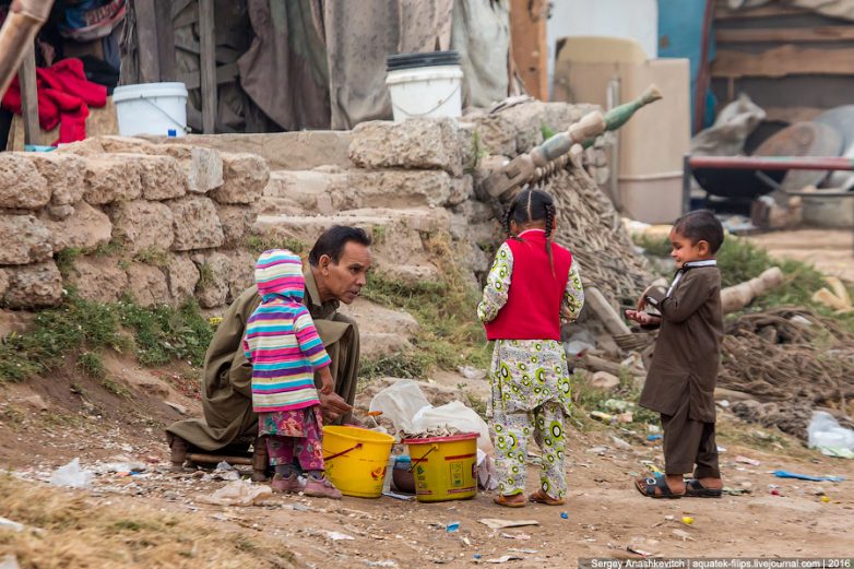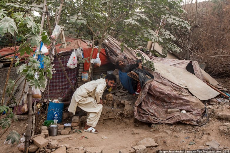 Люди здесь живут в хижинах, построенных из каких-то коробок, веток, кусков фанеры, вонючего тряпья и самого разного хлама. Живут огромными семьями и целыми общинами, напоминая гигантский цветастый муравейник на свалке. Если взглянуть на любой пакистанский город сверху — центральные районы непременно будут окружены одинаковым цветастым муравейником-свалкой, в которой по всей стране живут десятки миллионов жителей. Причем, живут совершенно счастливо. По сути, просто не зная, что другая жизнь вообще может существовать.