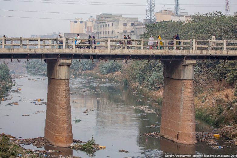 Трущобы, по которым мы прогуляемся, находятся в Равалпинди — первой столице Пакистана, которая сегодня является городом-спутников нынешней столицы Исламабада. Река, что на фото, отделяет гигантские кварталы трущоб от «приличных» кварталов, оставшихся на правом берегу реки. Да-да, вот то, что вы видите справа — это «приличные» кварталы, в которых живут люди, о которых можно смело сказать, что у них жизнь в какой-то степени удалась или им повезло родиться в относительно успешных семьях.