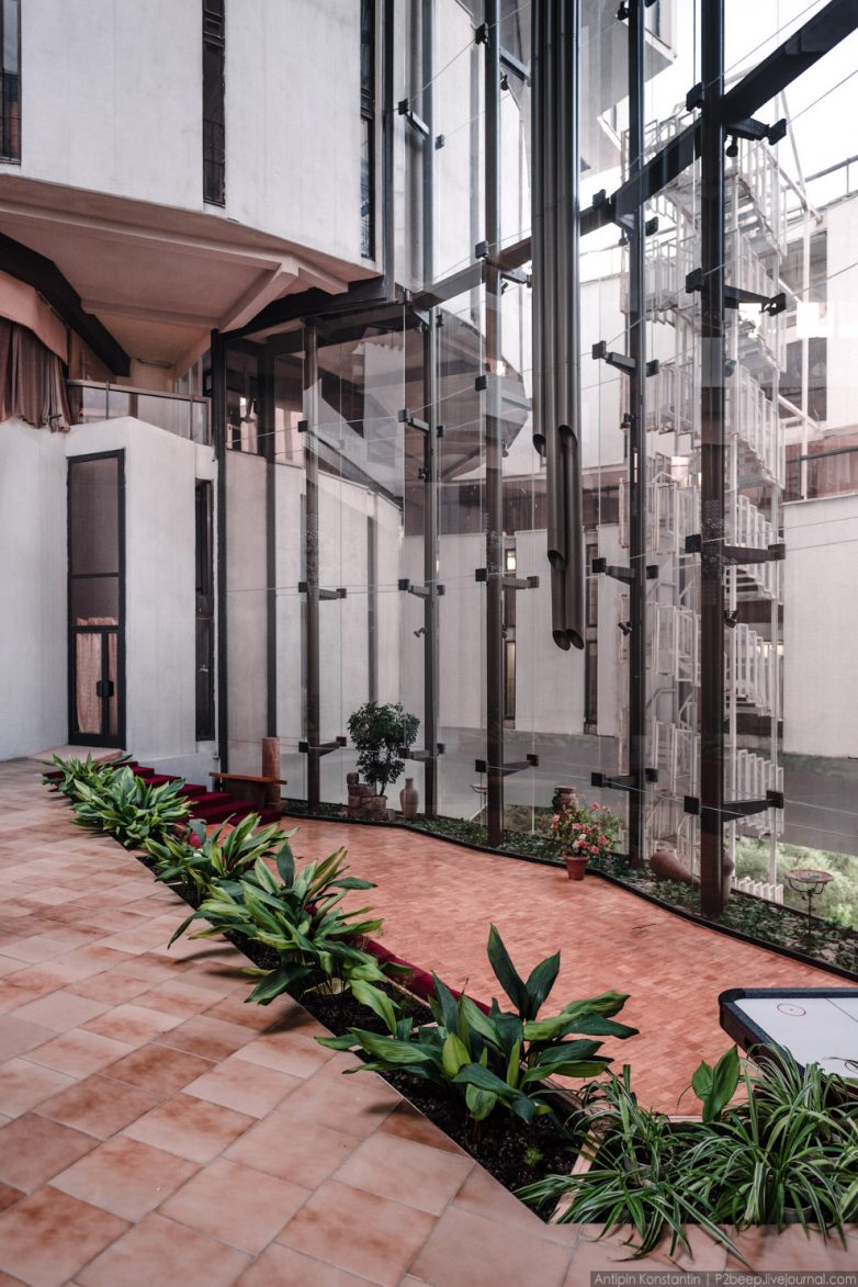 Для своего времени это был очень удачный проект! Мы, будучи еще мальчишками в середине 80-х, пробирались туда и глазели на невиданные в те времена для простых жителей СССР новшества: стеклянные лифты, гигантские витражи, отделка «как в Европе». А в столовой очень часто можно было видеть пожилые чешские пары, неспеша обедающие с чешским же пивом в бокалах.