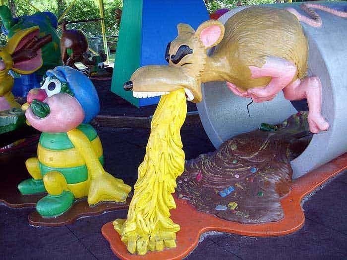 Среди множества веселых фигурок в парке «Бон Бон Лэнд» в датском городе Олструп эта крыса, которую явно тошнит, не слишком бросается в глаза. Но если ее все же заметишь, отсутствие аппетита на весь день гарантировано! Особенно пикантно, что в парке, помимо аттракционов, есть несколько лавочек по производству сладостей. Остается только надеяться, что крыса отравилась не местной продукцией.