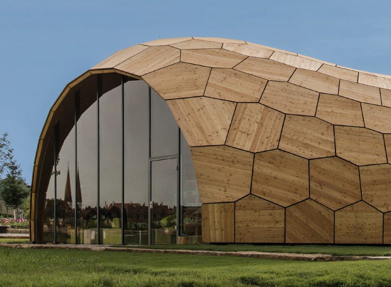 Выставочный зал Landesgarten в городе Швабиш-Гмюнд, Германия. Форма спроектирована на компьютере. Снаружи этот выставочный зал похож на скорлупу арахиса и состоит из 243 деревянных панелей.
