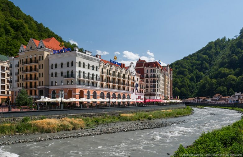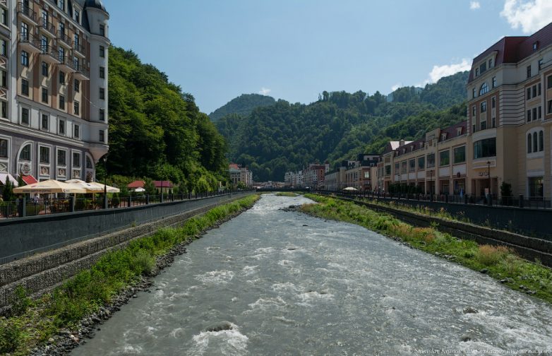 4. Река Мзымта нынче ограничена двумя набережными: наб. Панорама и наб. Лаванда. Также параллельно проходит Олимпийская улица.