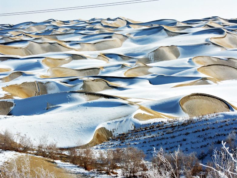 Одна из крупнейших песчаных пустынь планеты находится в Китае, Такла-Макан имеет площадь порядка 270 000 кв. км. Протяженность этой пустыни составляет 1 000 км, а ширина 400 км. Однако, эта пустыня привлекательна не только своими внушительными масштабами, но и невероятными «заснеженными» пейзажами. Несмотря на засушливый климат, в пустыне иногда выпадает снег, покрытые ослепительно белым снегом золотистые барханы выглядят просто поразительно.