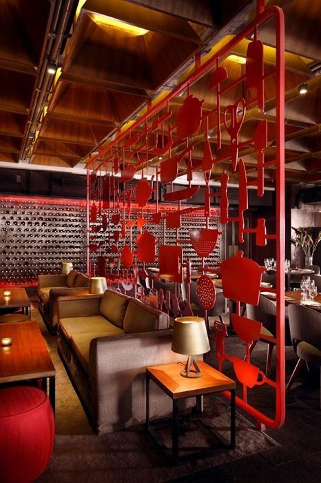 Особенностью этого ресторана являются горшки под потолком, которые создают необыкновенную атмосферу в заведении.