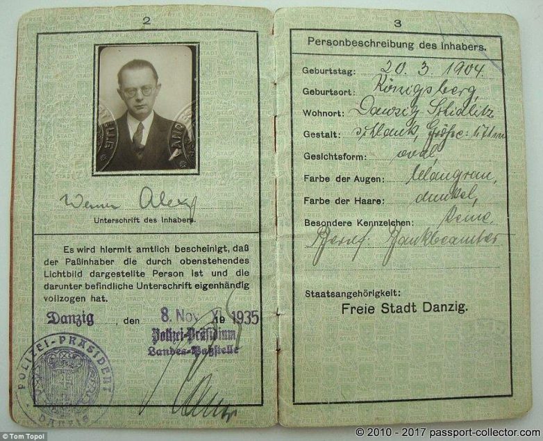 Вольный город Данциг включил в свои паспорта некоторые биометрические данные — в частности, форму лица владельца (в данном случае это овал). Город много веков был полуавтономной частью Пруссии.
