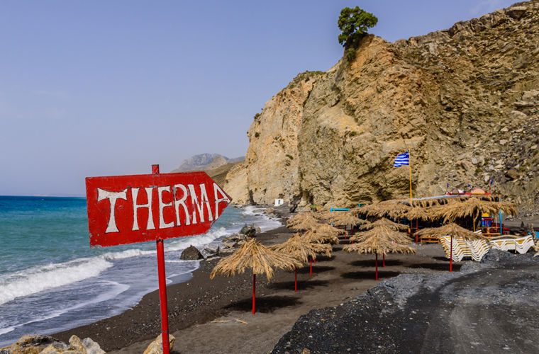 Термы представляют собой огороженный камнями бассейн на берегу. Поток из горячего источника встречается здесь с прохладными водами Эгейского моря. Подземные воды бьют горячим — 49 °С, так что с этой стороны держатся разве что стойкие гречанки-пенсионерки. Они приходят на термы с подружками поправить здоровье — в помаде и с прическами. Туристы держатся у того края «бассейна», что ближе к морю — тут прохладнее. Вода, бьющая из источника, содержит сероводород, будьте готовы к «аромату».