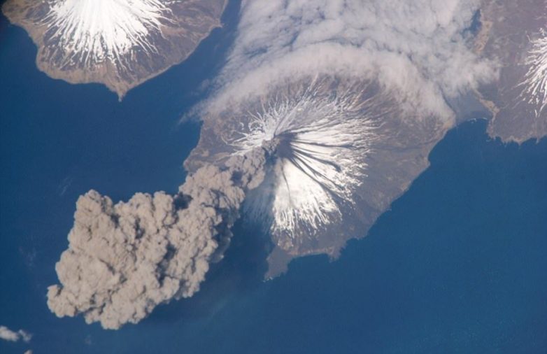 Извержение вулкана Сарычева на острове Матуа Большой Курильской гряды в 2009 году. Вид с борта Международной космической станции.