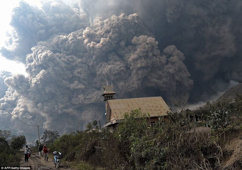 Огромное облако вулканического пепла обрушивается на деревню в округе Каро на острове Суманта в Индонезии во время извержения вулкана Синабунг 1 февраля 2014 года.