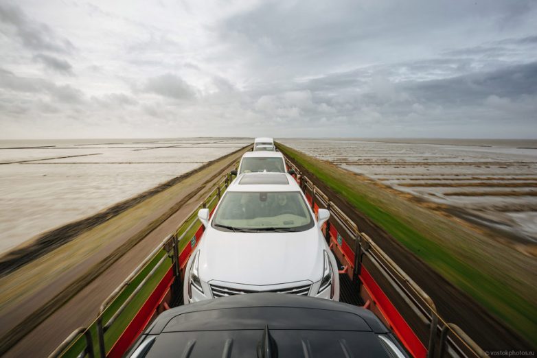 Вся переправа занимает около 35 минут. С погрузкой-разгрузкой — 50. Во время движения выходить из автомобиля нельзя, да и не хочется — во-первых очень тесно, во-вторых поезд идет со скоростью 100 км/ч. Переправить одну легковушку стоит 90 евро. Каждый день по дамбе проезжает около 100 поездов, из которых половина приспособлена для перевозки автомобилей.