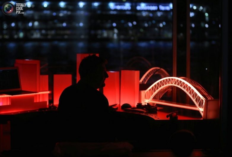 Оператор в центре управления подсветкой моста Харбор-Бридж и зданий, расположенных на берегу бухты Серкулар Куэй.