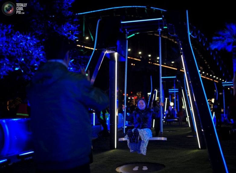 Гости фестиваля музыки и света Vivid Sydney фотографируются на качелях возле моста Харбор-Бридж.
