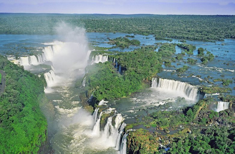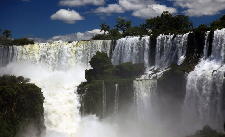 Крупнейший водопад — Горло Дьявола — U-образный обрыв шириной 150 и длиной 700 метров. Лучший вид на него открывается со стороны Бразилии. А так, большинство водопадов находятся в пределах территории Аргентины. В центре фотографии видны люди для сравнения масштабов:
