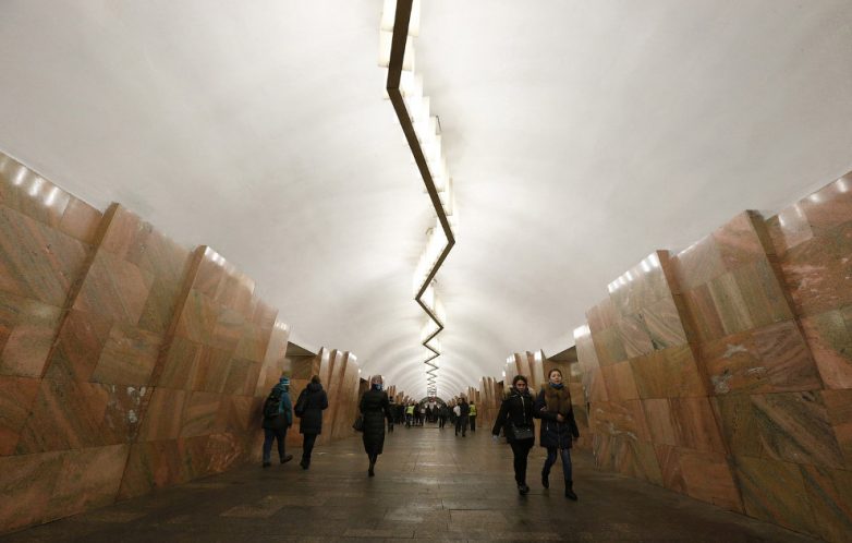 Станция метро «Щукинская». В отделке стен подземных вестибюлей использован розовый мрамор.