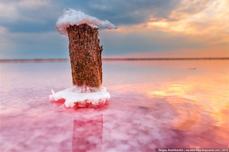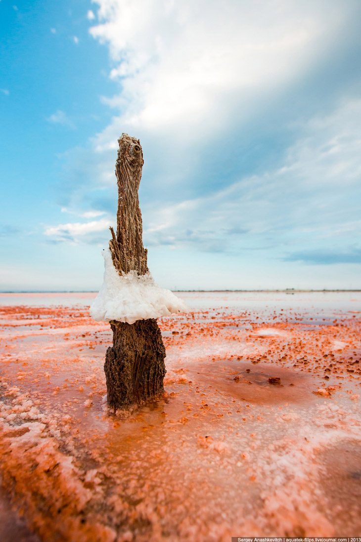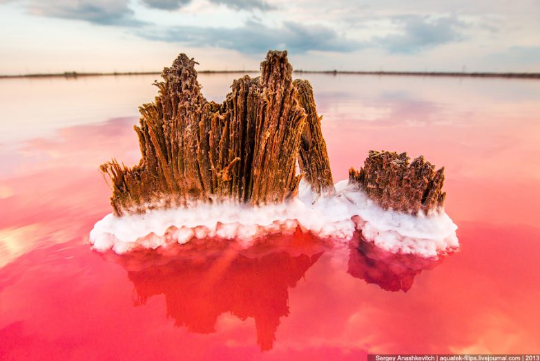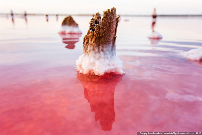 Все эти столбики — остатки соляных промыслов, которых в Крыму было очень много во времена Союза. Где найти всю эту красоту? В северной части Крыма огромное количество соляных озер с самым разным цветом воды, остатками сольпрома, даже затопленными деревьями.